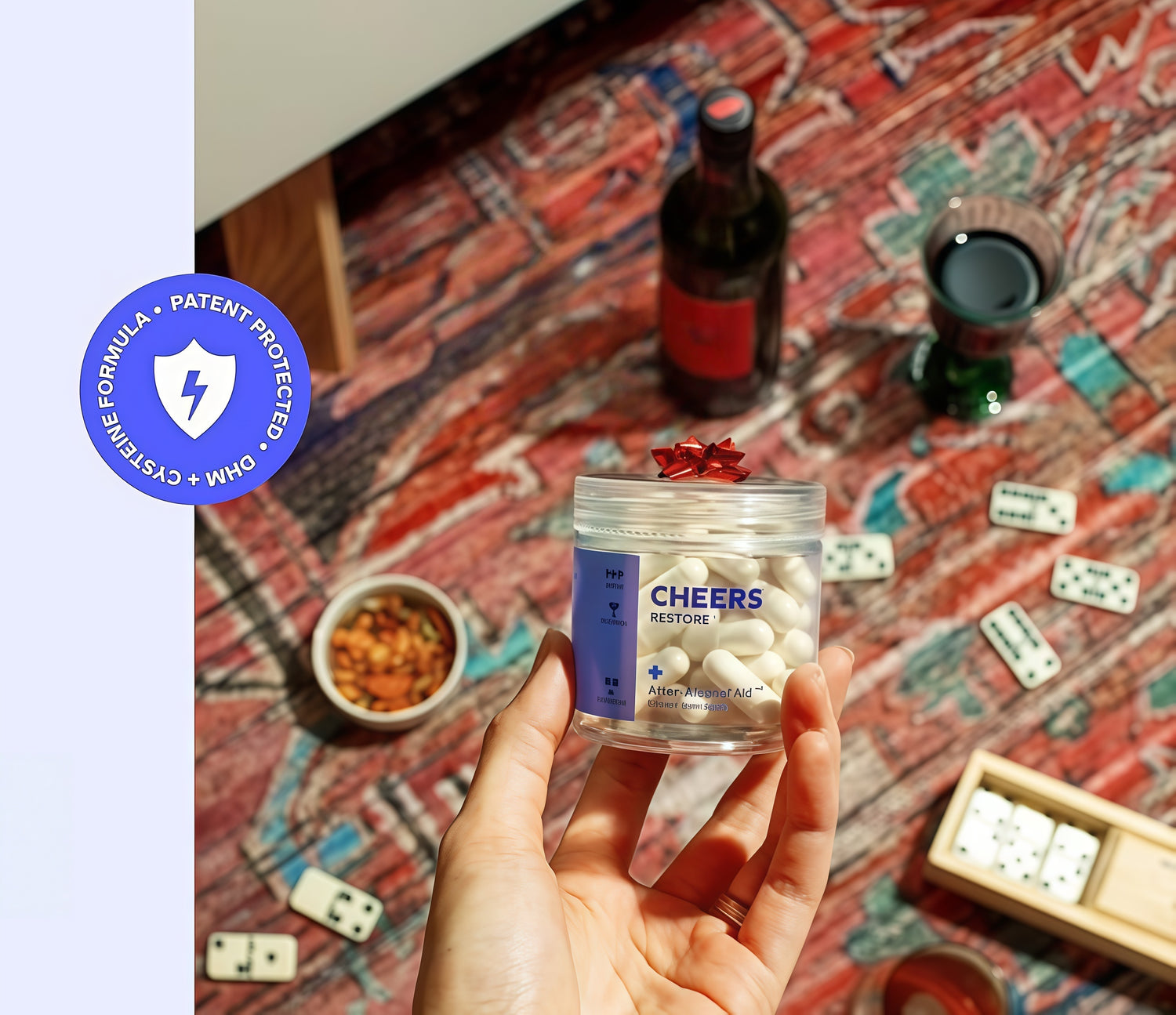 In a human study conducted for our granted patent, users of Cheers Restore felt an average of 50%+ better the next day across 8 typical effects1.